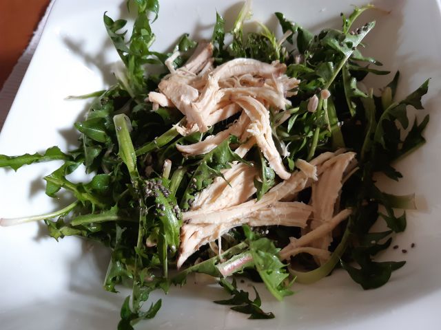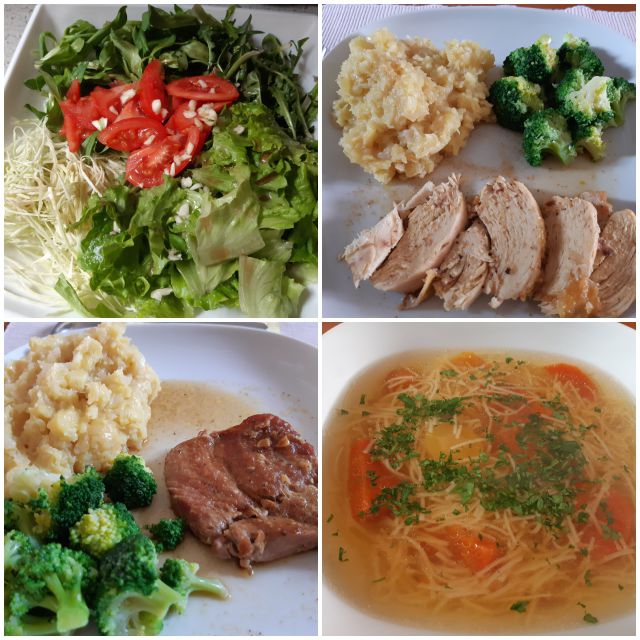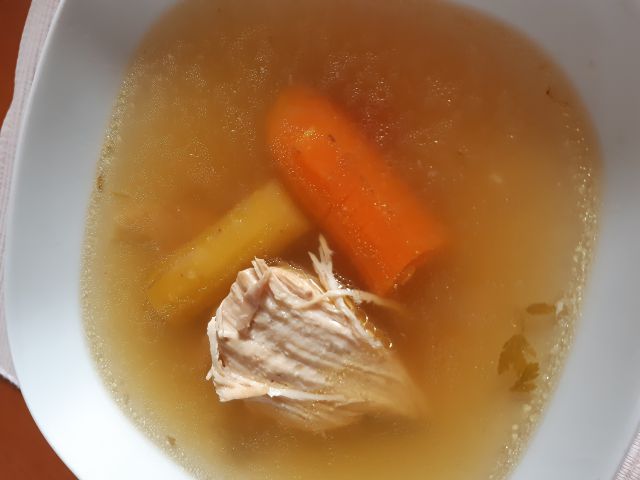 V soboto sta moja dva jedla zunaj, ker sta bila po opravkih, jaz kokošjo juho in regrat s kokošjim mesom.