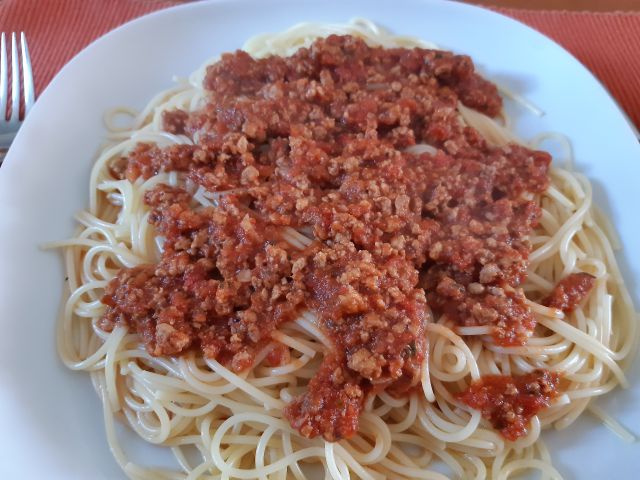 Včeraj bolognese omaka iz zaloge, špageti, zelena solata