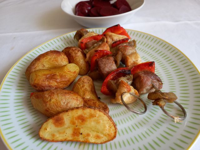 Pečen krompir, mesno-zelenjavna nabodala; rdeča pesa