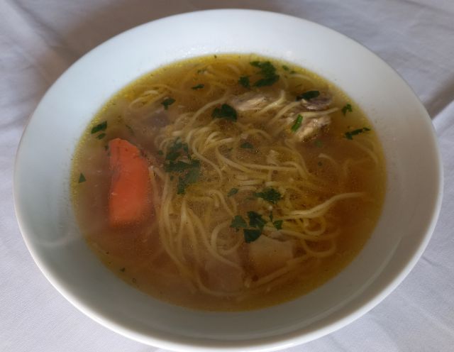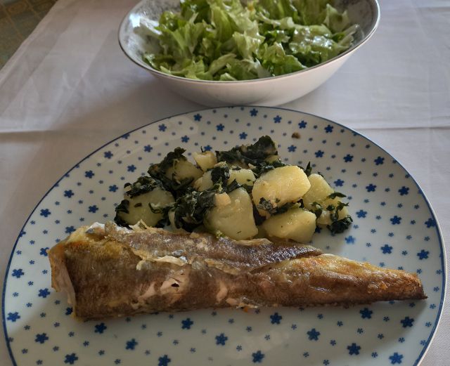 Piščančja juhica; pečen oslič, krompir s špinačo in veliko česna; zelena solata