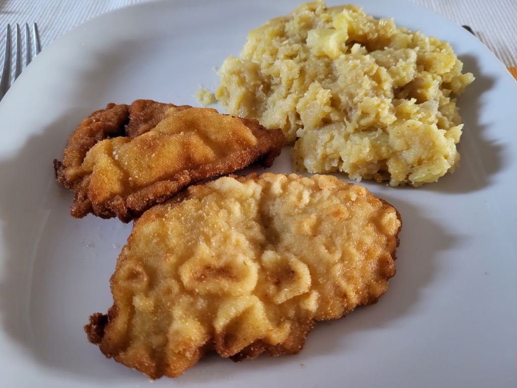 28.2 obisk hčerke z družino - meso po dunajsko in pečeno, pražen krompir, solata,.jabolčna pita