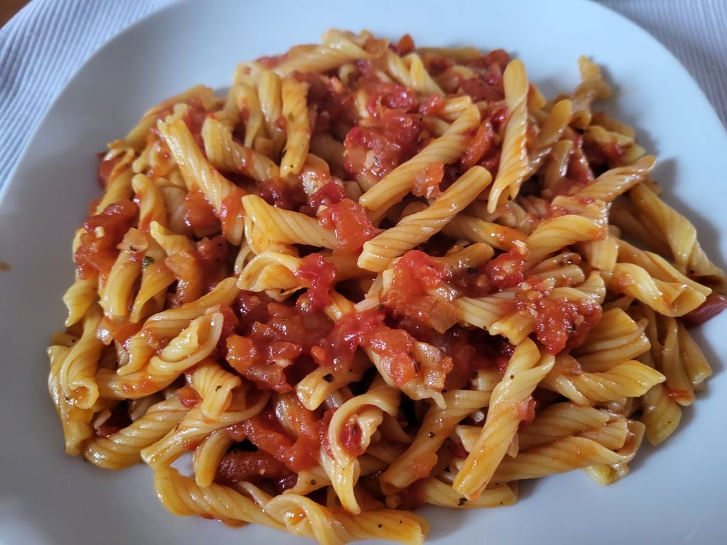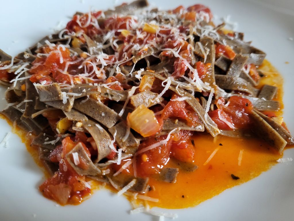 2.3 testenine s paradižnikovo omako, zame z ajdovimi rezanci, solata