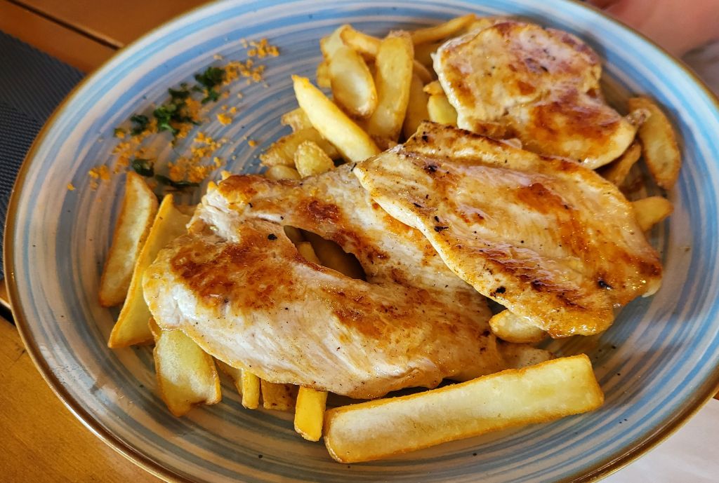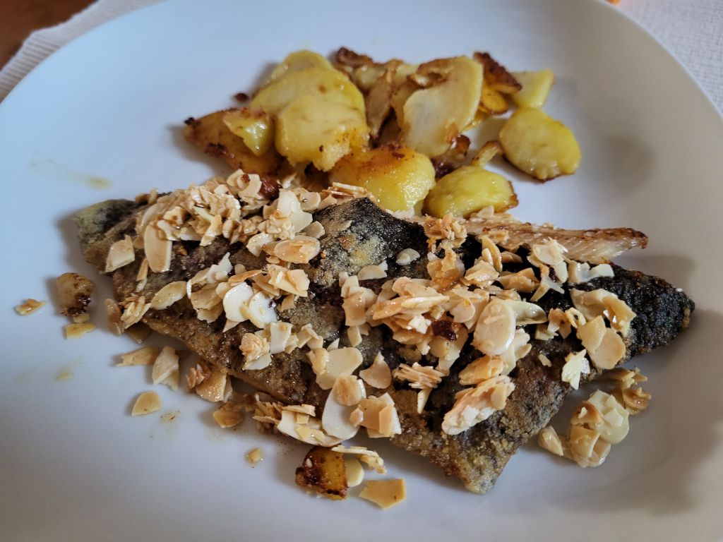 5.3 musaka, zame file postrvi z mandlju, solata