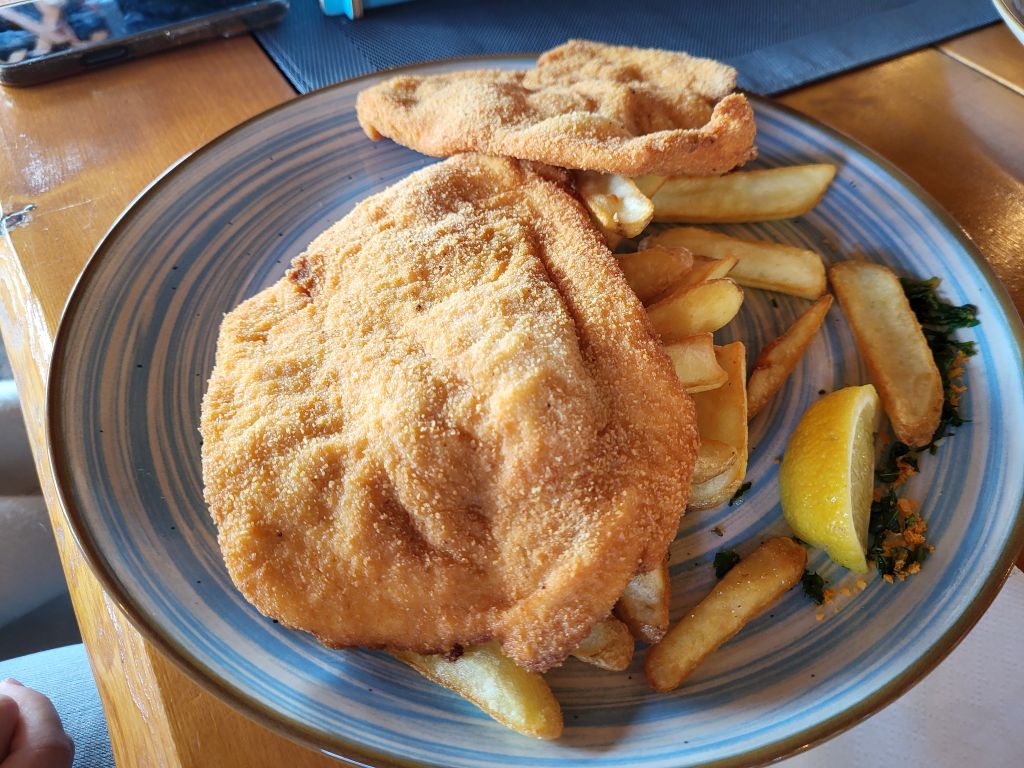 1.3. goveja juha iz zaloge, bučna juha, meso po dunajsko, popečeno s sirom, pražen krompir, solata, pita