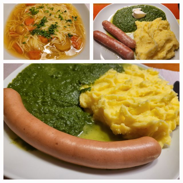 Danes goveja juha z rezanci, špinača, pire krompir, hrenovke..