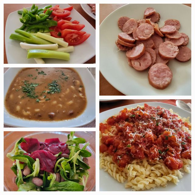 Danes za moža fižolova juha, kranjska klobasa, zelenjava in kruh, za naju s sinom svedrčki s paradižnikovo omako, solata