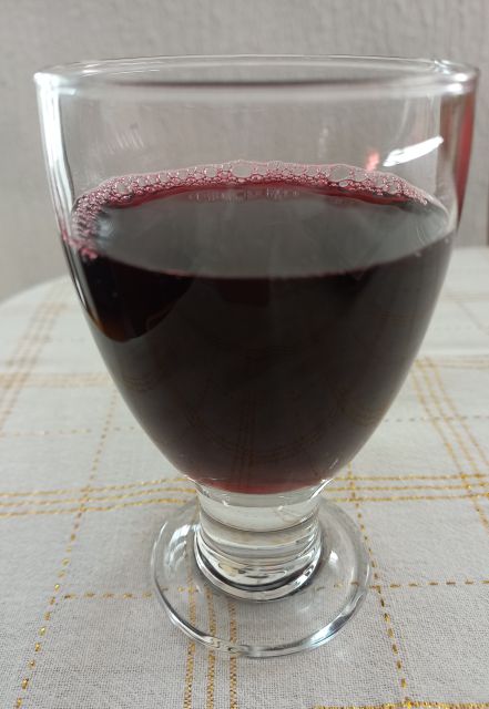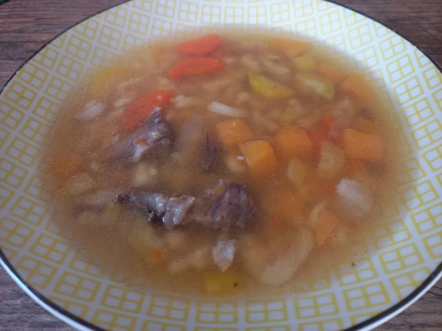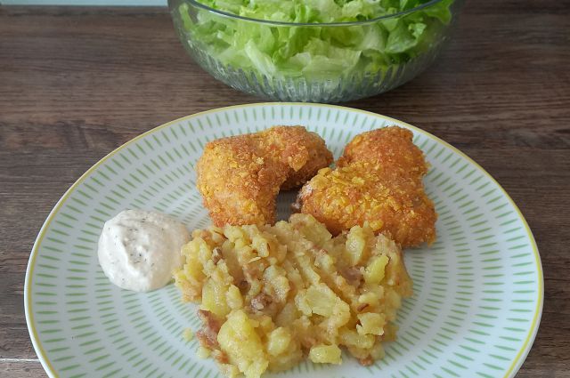 Juhica od včeraj; pražen krompir, panirane perutničke, koprov zos; zelena solata; kozarec vina