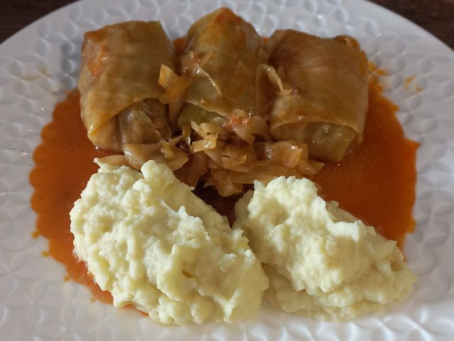 Porovo-korenčkova juhica; sarma (donirana), pire krompir/zelena