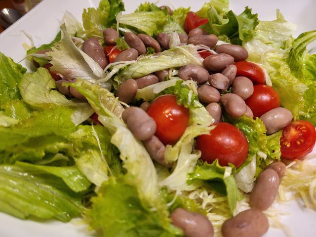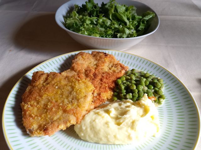 Goveja juhica (od včeraj), paniran puranji zrezek, grah v omaki, pire krompir; zelena solata