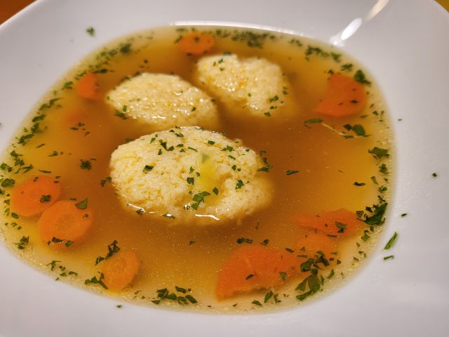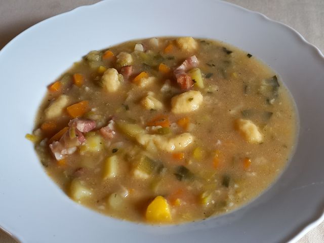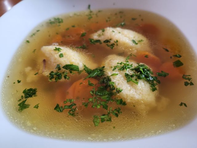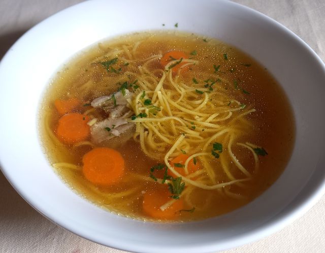 Danes goveja juha z zdrobovimi cmoki, ostanek pečenke od včeraj, pražen krompir, zeljna solata