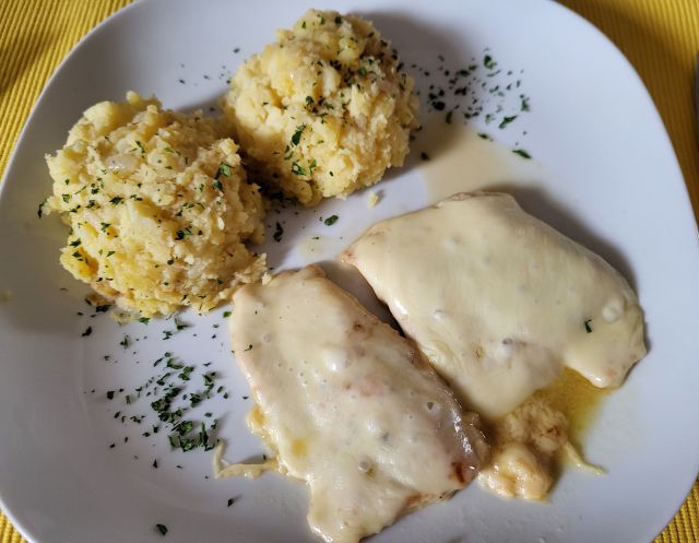 Danes za enega ostanek juhe od včeraj, naravni puranji zrezki s sirom, ostanek praženega krompirja, zeljna solata. Za moža špageti z zelenjavno omako, mešana solata.