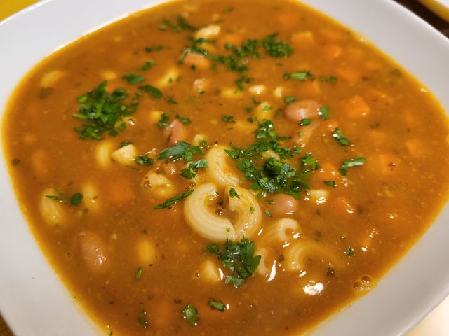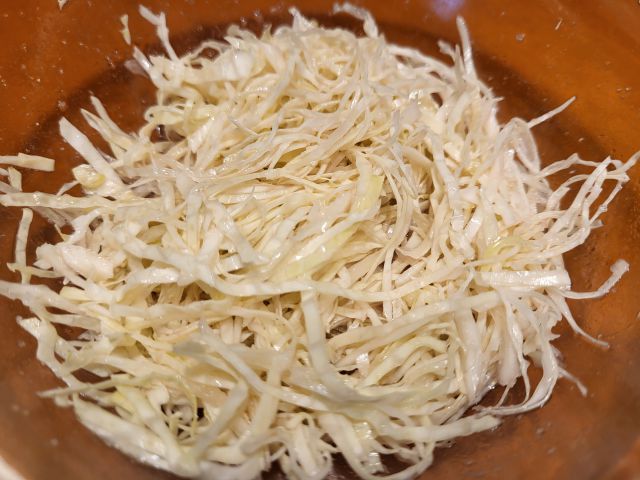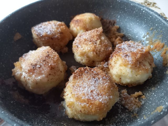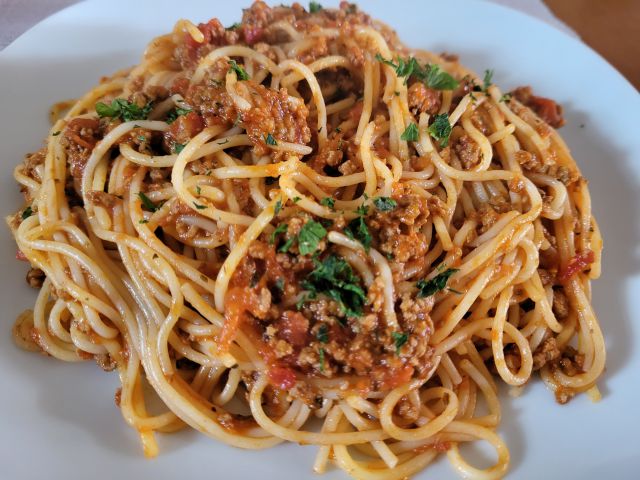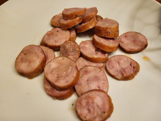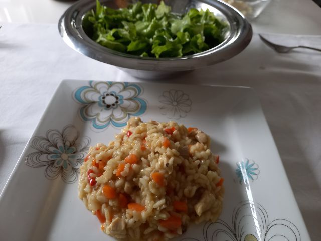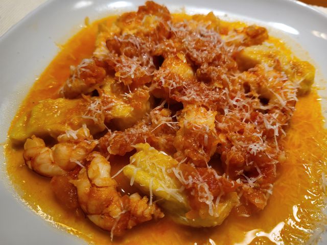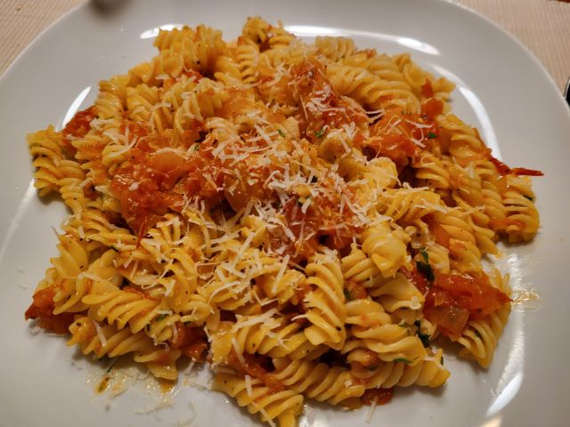 Včeraj jaz zeljno solato, bučne njoke s skuto iz zaloge z gamberi v paradižnikovi omaki, mož pašta fižol, kranjsko klobaso, kruh, sin zvečer svedrčke s paradižnikovo omako