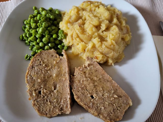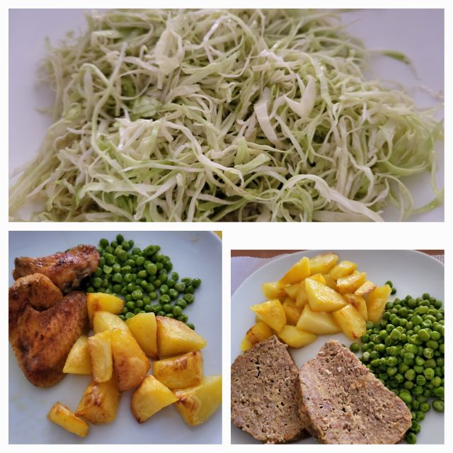 Včeraj mesna pečenka, piščančje peruti, pečen krompir, grah v omaki, zeljna solata