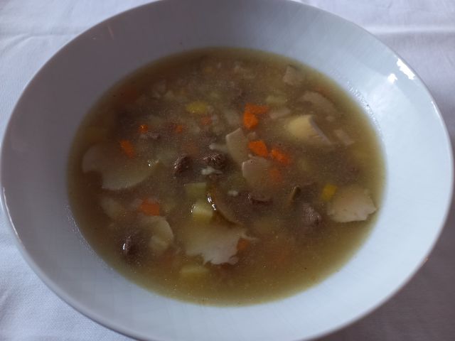 Gobova juhica, ostanki piščančjega paprikaša od včeraj; slivovi cmoki