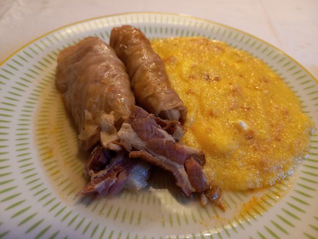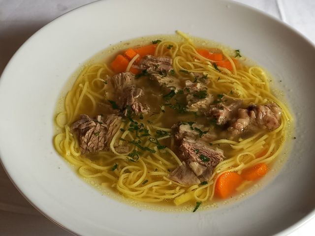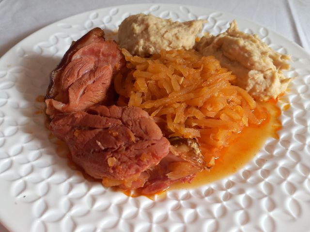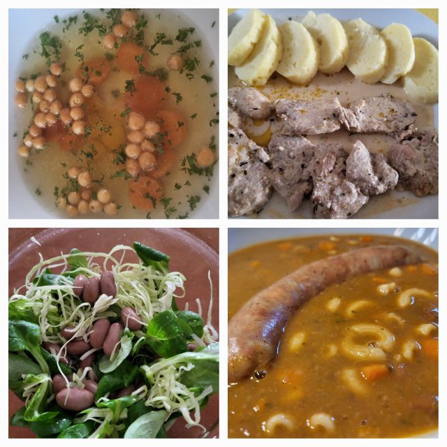 Danes mož ostanek fižolove pašte s kranjsko klobaso, sin in jaz govejo juho, ostanek mesa od sobote z zdrobovo štruco, solata s fižolom