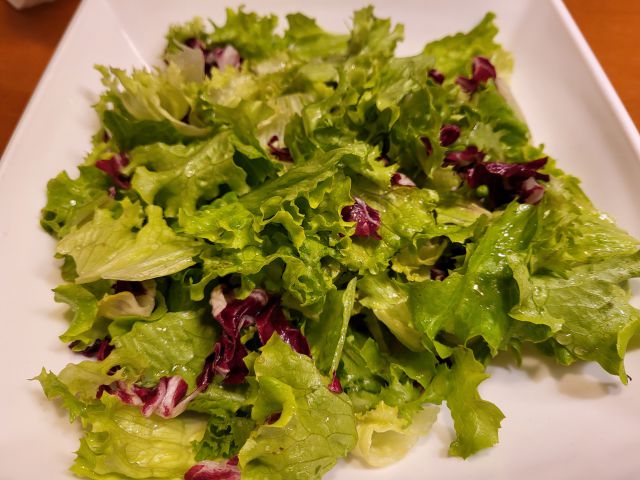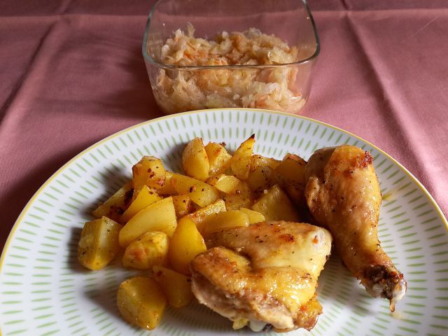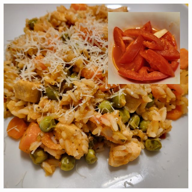 Včeraj piščančja rižota, paradižnikova solata, za moža poleg solate hrenovka, kruh
