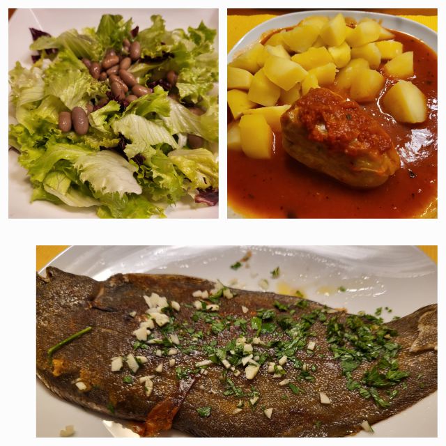 Včeraj zelenjavna juha, pečeni trakci vratovine v omaki z bučkami, zdrobova rolada, solata, sadje