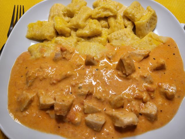 Včeraj za moža ostanek čuftov, za naju s sinom piščančji koščki v omaki, bučno- skutni njoki, solata