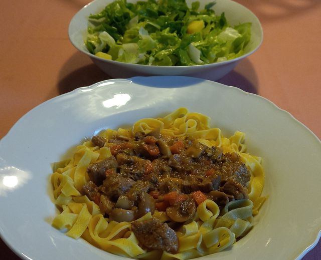 Telečje nakockano s šampinjoni, široki rezanci; endivija s krompirjem