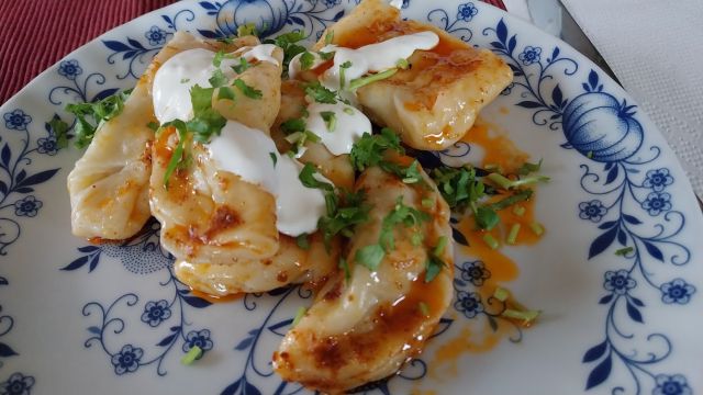 Klepe. Obožujemo. Manj je več. Mokka, voda, jajce in sol za testo, nadev iz mletega mesa, čebule, soli in popra, skuhano, prelito z raztopljenim maslom z dodatkom mlete paprike, navrh pa kisla smetana. Pa peteršilj, da je fotka lepša.