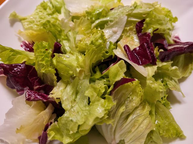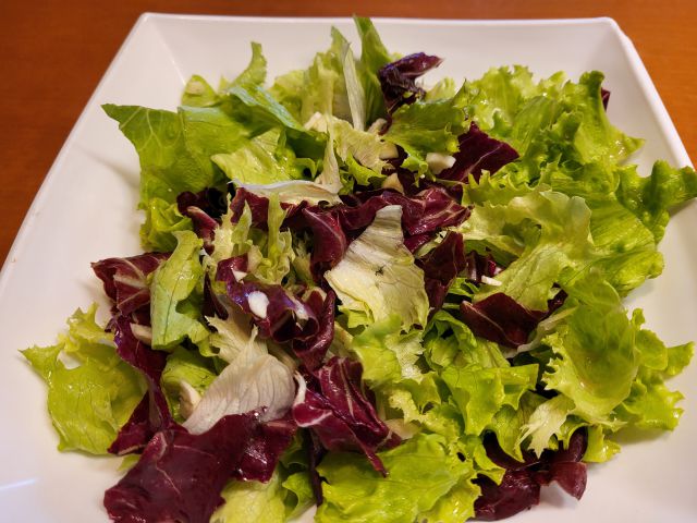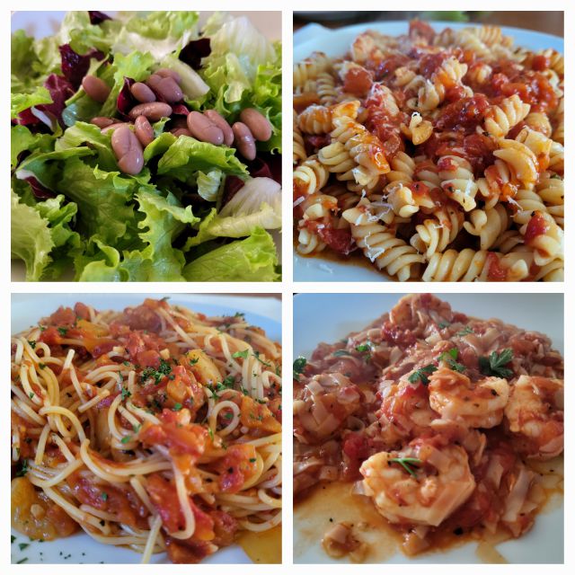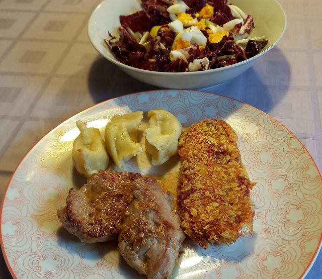 Panirana paprika s sirom, sv.ribica na česnu z vinom, ravioli; rdeči radič s krompirjem in jajčkom
