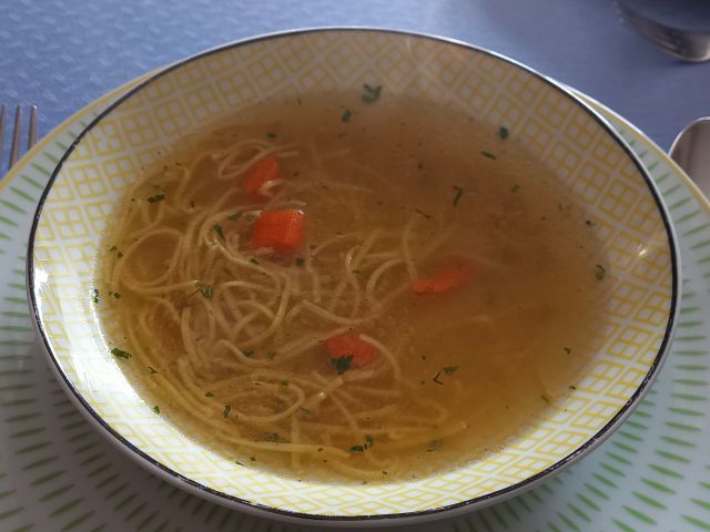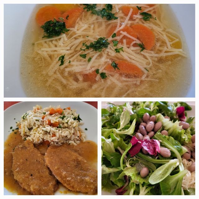 Včeraj goveja juha z rezanci, meso v omaki, zelenjavni riž, solata