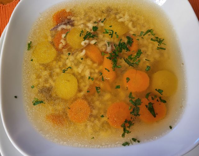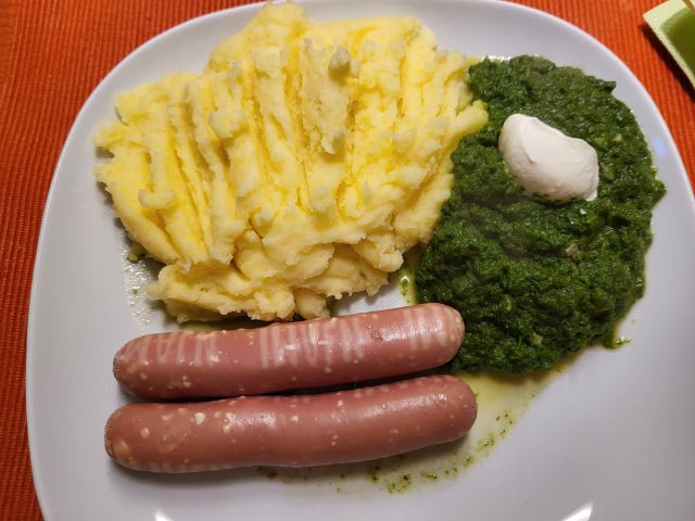 Danes goveja juha z ribano kašo, pire krompir, špinača, hrenovke