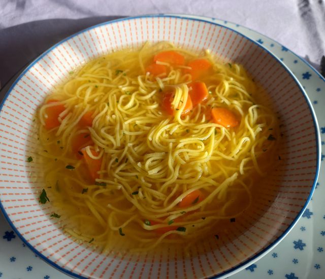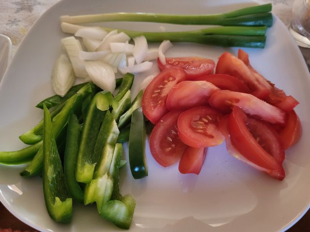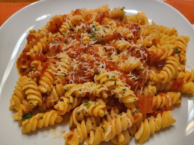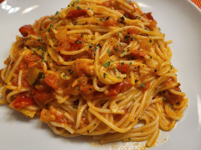 Danes svedrčki s paradižnikovo omako, špageti z zelenjavno omako, malo čilija, solata