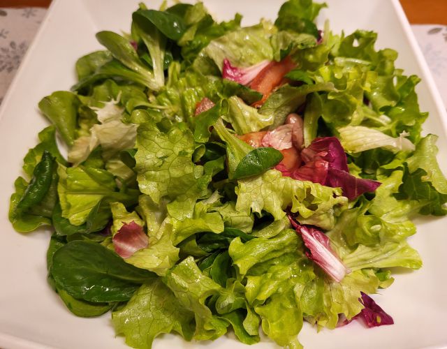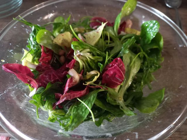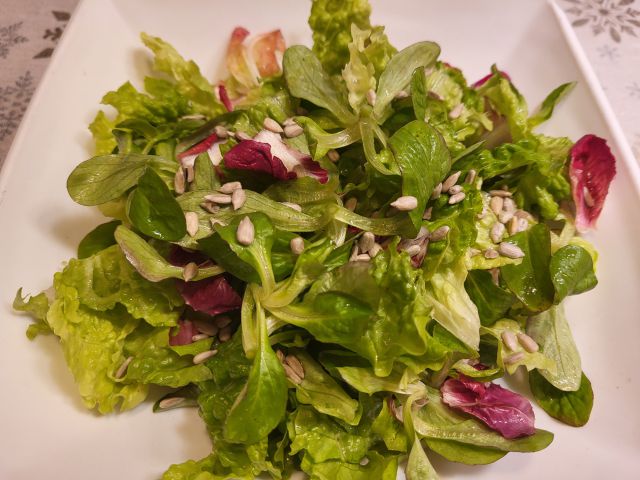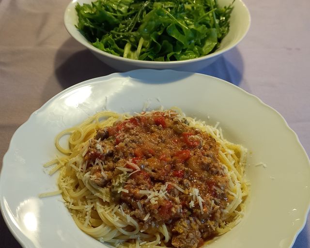 Špageti z bologneze omako; zelena solata in rukolo; krof