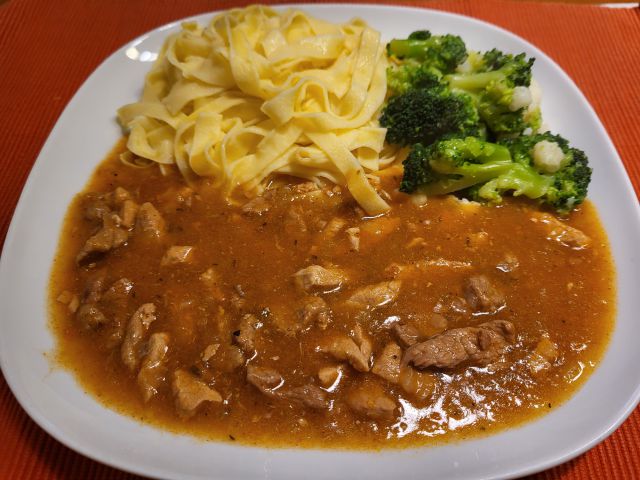 Danes teletina v omaki ( iz zaloge), široki rezanci, solata.