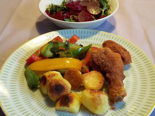 Pečen krompir; bučke, večbarvna paprika in por iz voka; paniran piščanec; rdeča pesa na rukoli