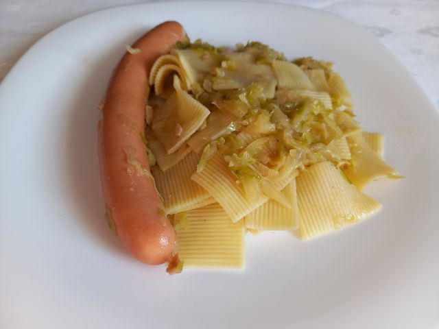 Včeraj:- goveja juha z rezanci, kislo zelje, pečenice, krompir v kosih
