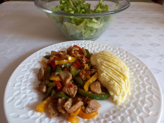 Popečeno meso s čebulo in papriko, pire krompir; zelena solata; zapečene palačinke