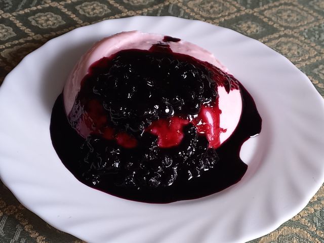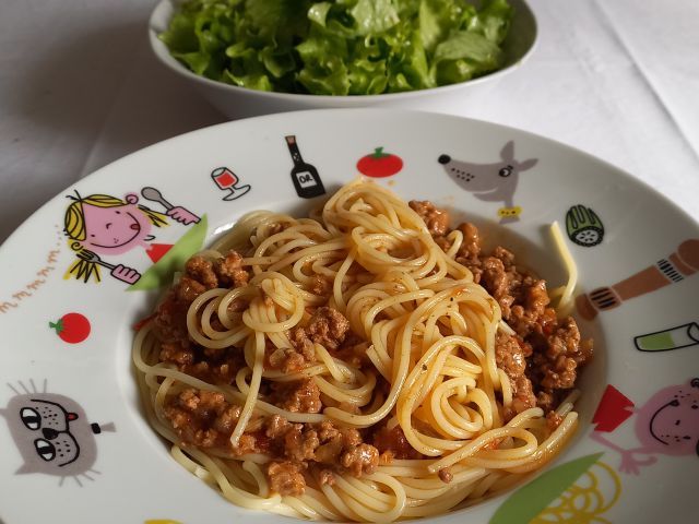 Špageti z bologneze omako, zelena solata; puding, zmečkane borovnice