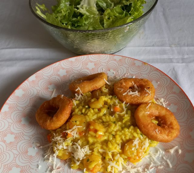 Kremna zelenjavna juhica; kozice v rižoti, po vrhu še panirani krogci kalamar; zelena solata z zeljem; zagrebška rezina... (krof je bil dopoldan)