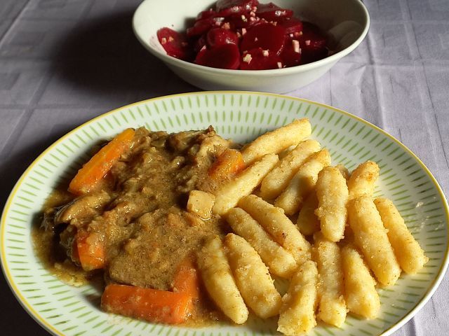 Goveji zrezki v jurčkovi omaki, svaljki na drobtinah; rdeča pesa