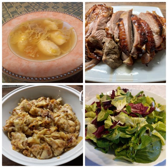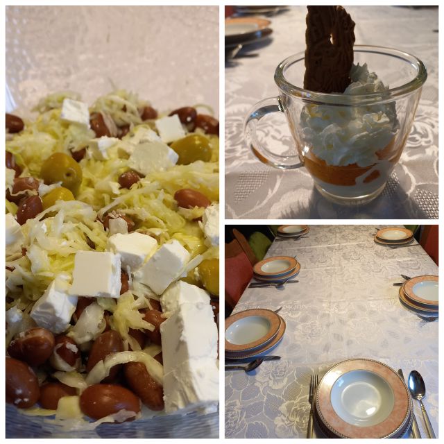 Goveje/piščančja juhica z jetrnimi knedlčki in rezanci; mlinci, pečeno puranje bedro, večbarvni radič, zelje s fižolom, feto in olivami; sladica v kozarcu (grški jogurt, kakijeva strjenka smetana in piškot)