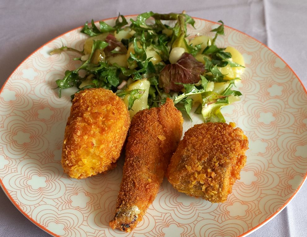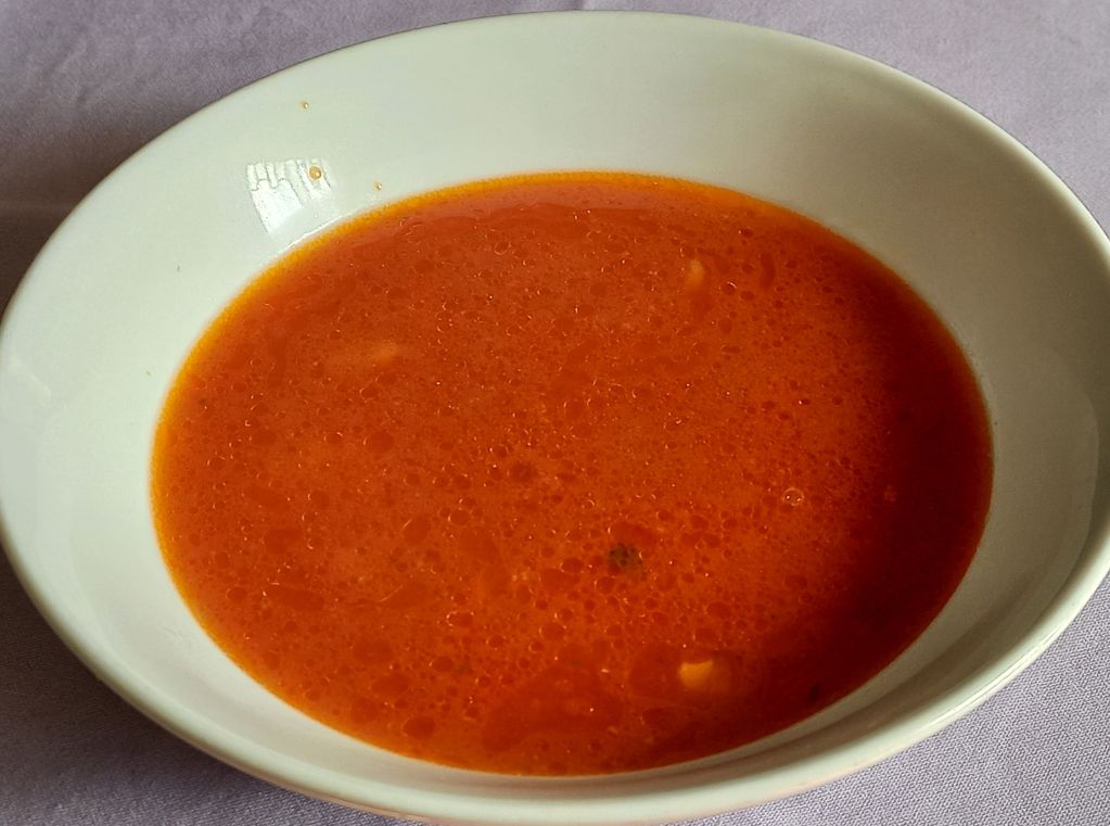 Paradižnikova juhica z rizoni; regrat s krompirjem, v koruznih kosmičih paniran oslič