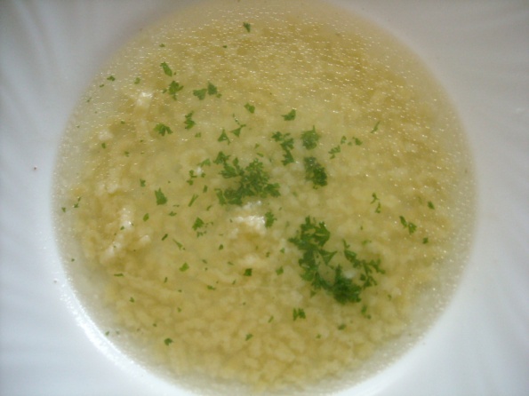 Goveja juhica z zdrobovimi cmočki, polnjene paprike in krompir v kosih