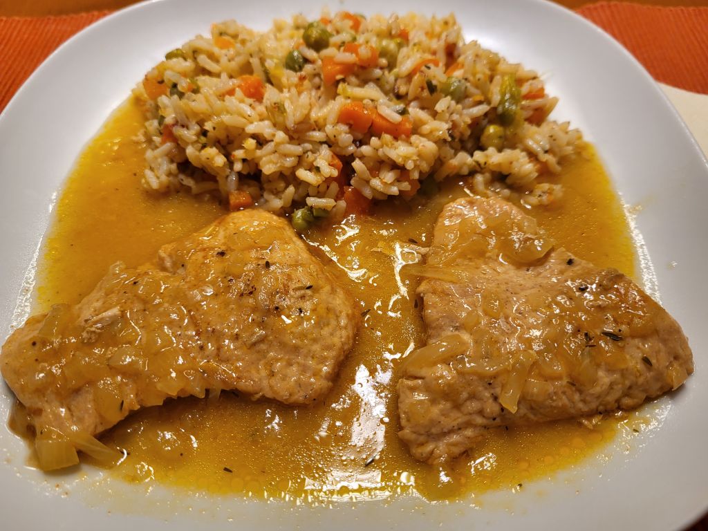 4.2 zrezki v omaki, zelenjavni riž, solata
