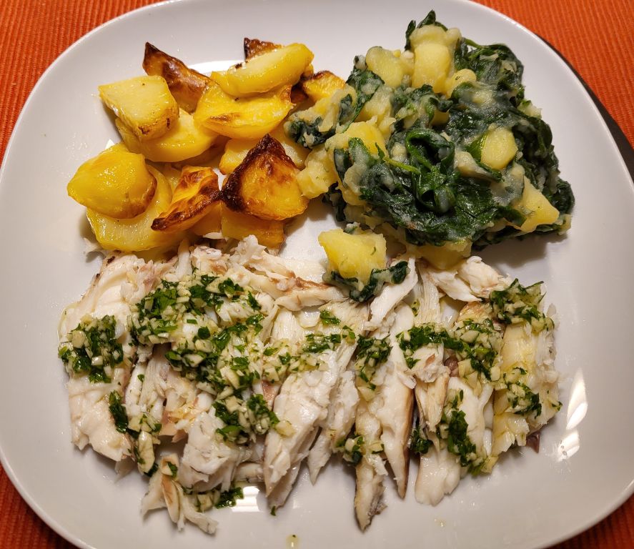 5.2 goveja juha, špinača, pire krompir, hrenovke, losos