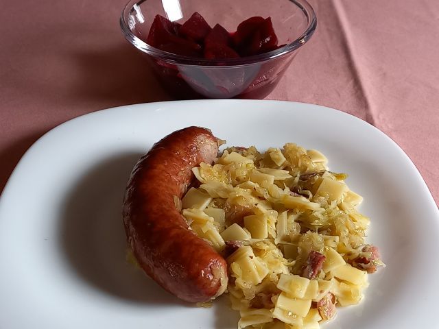 Zelje s krpicama, kuhana klobasa; rdeča pesa