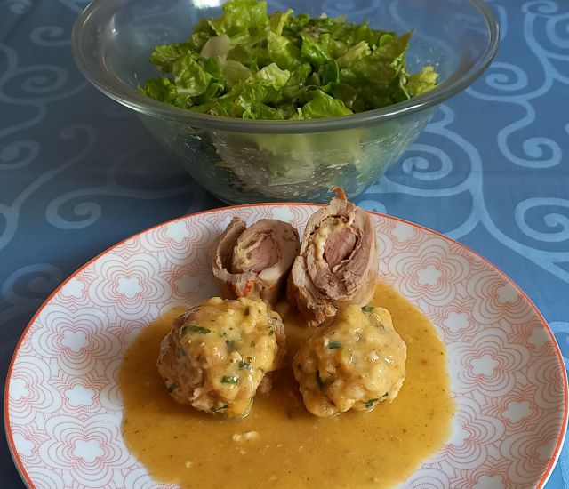 Goveja juhica; nadevana sv.ribica v omaki, kruhovi cmoki; zelena solata