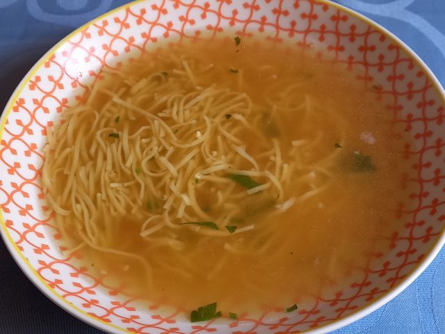 Danes goveja juha z rezanci, pohan piščanec, ajdova kaša z beluši, solata, palačinke z malinami, kava