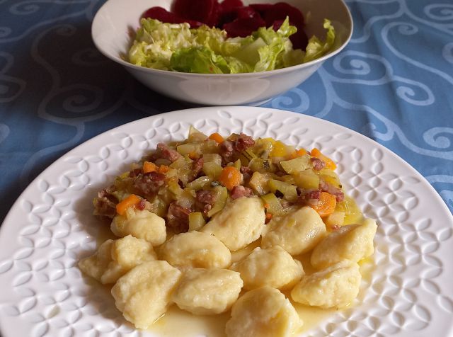 Včeraj bučkina juha, goveji zrezki v omaki, špinačni njoki, solata, kava
