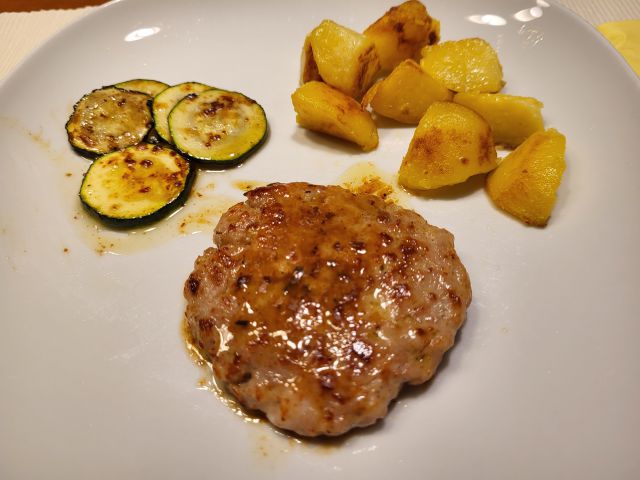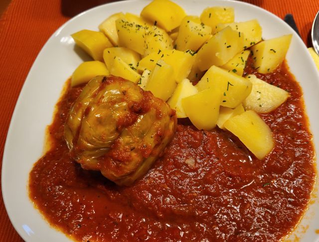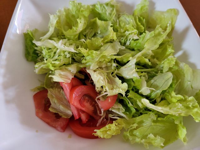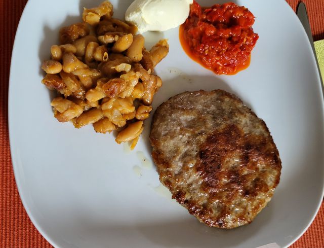 26.6 mož filano papriko iz zaloge, krompir, solato, jaz piščančjo pleskavico, krompir, sin ostanek mesne pečenke, krompir, solato