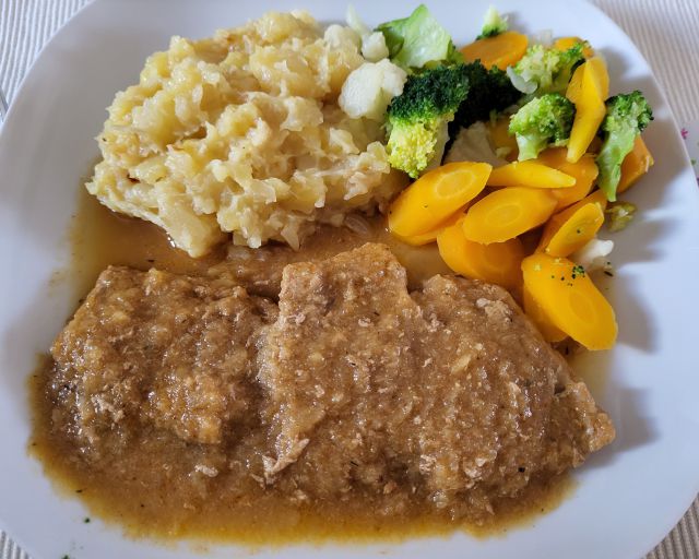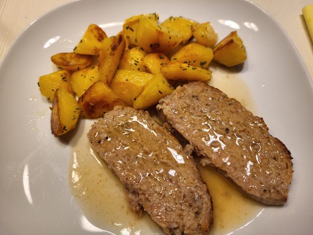1.6 telečji zrezki v omaki, pražen krompir, zelenjava, solata
