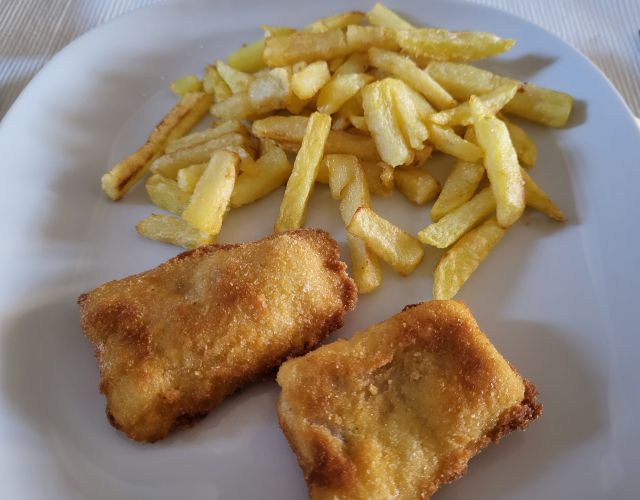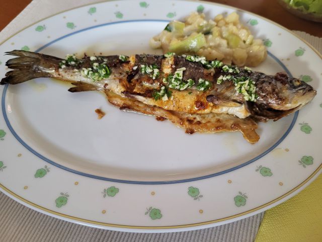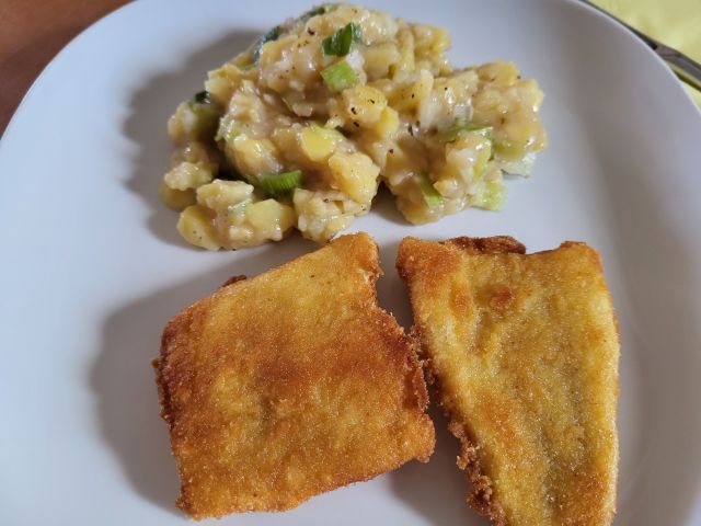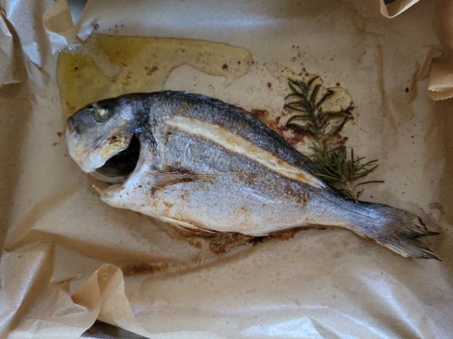 30.5 paniran oslič za moža in sina, zame pečena orada, midva z možem krompirjevo solato, sin pomfri in kumarično solato