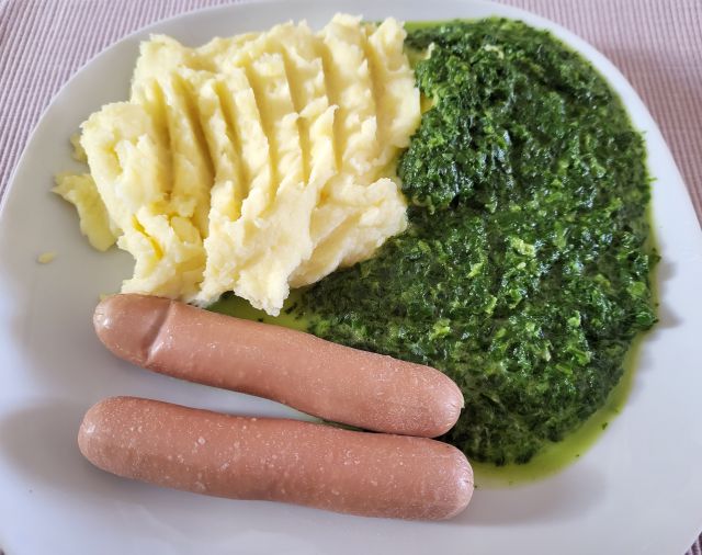 31.5 goveja juha iz zaloge, špinača, pire krompir, hrenovke, zame pečena postrv