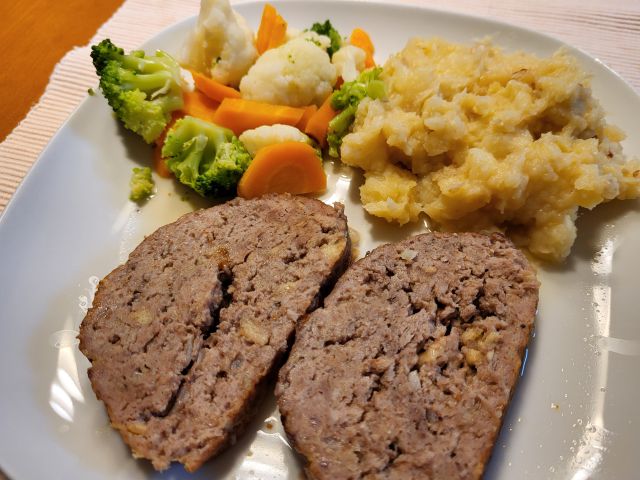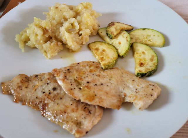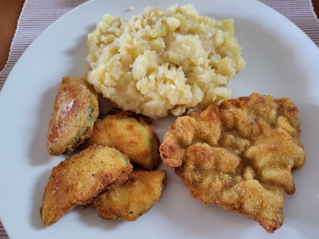 10.8. Meso po dunjsko, panirane bučke, zame naravno pečeno meso, pražen krompir, solata